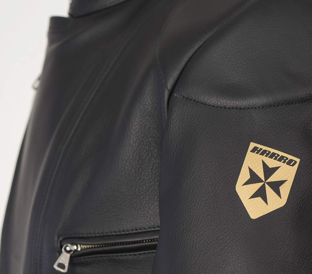 Mit dem goldenen HARRO-Logo auf dem linken Oberarm, dem dunkelroten Steppfutter, schrägen Front-Reißverschluss und dem angearbeiteten Nierengurt ist die Rennweste unverwechselbar.